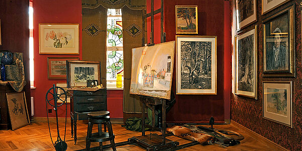 Na I piętrze zwiedzić można dwie „pracownie artysty; malarską i graficzną” – zaaranżowane jako przestrzeń ekspozycyjna przypominająca miejsce pracy. W części „malarskiej” znajdą się wybitne dzieła, ponadto szkice, prace nieukończone z różnych okresów twórczych, również z Gościeradza, z ulubionym motywem drzew. Są wśród nich XIX-wieczne wczesne portrety, m.in.: Kunegunda Falińska, Prof. Ludwik Rydygier z asystentami, martwe natury, przedstawienia architektury, pejzaże, wykonane olejno, pastelami, akwarelą, tuszem oraz ołówkiem. Pracownia malarska wzbogacona została o oryginalną sztalugę na szynach, nazywaną przez artystę „tramwajem gościeradzkim”.