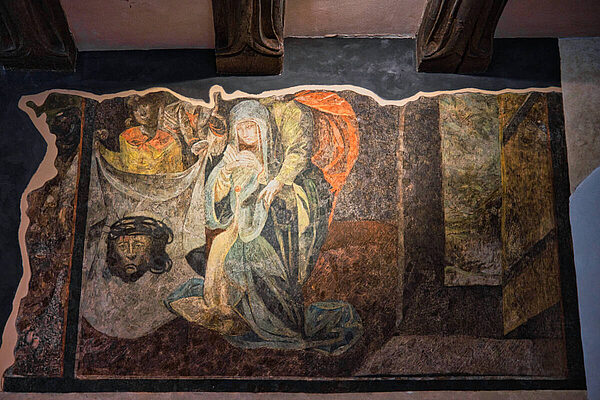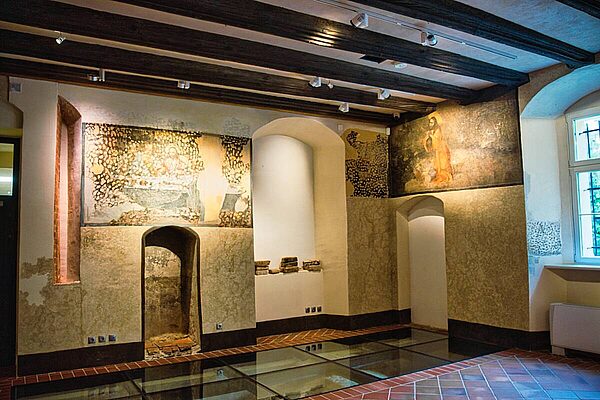 Przez dziesięciolecia tajemnice ścian dawnego refektarza były ukryte pod warstwami tynku i farby. Jak się okazało, wnętrze zostało pokryte manierystycznymi polichromiami, które przedstawiają cykl pasyjny. Kompozycja przedstawień w układzie pasowym obiega górną części ścian. Można wyróżnić poszczególne sceny, które zaczyna Ostatnia Wieczerza. Malowidła są wykonane w technice tempery jajowej na barwionej pobiale wapiennej położonej na tynku. Cechy stylowe i kolorystyka wskazują na silne wpływy malarstwa i grafiki północnoeuropejskiej oraz sięganie do wzorców nie tylko nowożytnych, ale i nawet późnogotyckich. W ich datowaniu pomogła data 1616 wyryta w kartuszu na centralnej belce stropowej. Do nowo wybudowanej siedziby klaryski wprowadziły się w roku 1618, zatem czas powstania malowideł można zatem wiązać z latami 1616-18.
