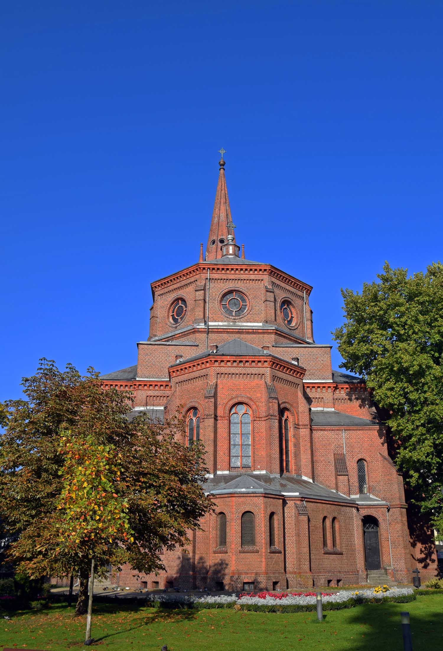Spod „Hotelu pod Orłem” udajemy się w prawo w kierunku placu Wolności, mijając 16 – klasycystyczną kamienicę projektu Carla Semphla (1882 r.). Następnie zobaczymy dominującą wieżę Kościoła św. Piotra i Pawła [6] zaprojektowanego przez berlińskiego architekta Fryderyka Adlera. Kamień węgielny został wmurowany w 1872 r. Kościół, dawniej ewangelicki, aktualnie katolicki, zbudowany został na planie krzyża łacińskiego. W wystroju przestronnego wnętrza uwagę przyciągają witraże w prezbiterium, wykonane w Cesarskim Instytucie Witrażowym w Berlinie, ufundowane przez cesarza Wilhelma I.