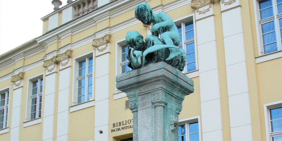 Udajemy się teraz ulicą Jana Kazimierza w kierunku Starego Rynku. Całość zabudowy po zachodniej stronie ulicy zajmuje klasycystyczny gmach Wojewódzkiej i Miejskiej Biblioteki Publicznej im. dr. Witolda Bełzy, wzniesiony w XVIII w. na potrzeby pruskiej administracji. W budynku przechowywana jest poklasztorna biblioteka należąca niegdyś do bydgoskiego klasztoru bernardynów. Jest to najstarszy zachowany w mieście księgozbiór, którego początki sięgają schyłku XV w. Przed wejściem głównym do biblioteki znajduje się urocza rzeźba-fontanna „Dzieci bawiące się z gęsią” (22), dzieło Karla P. Kowalczewskiego, które od 1909 r. ozdabia Stary Rynek. Pierwotnie znajdowała się przed apteką pod „Złotym Orłem”, gdyż ufundowana została przez jej właścicieli, rodzinę Kupffenderów, z okazji 100-lecia prowadzenia przez nich apteki.