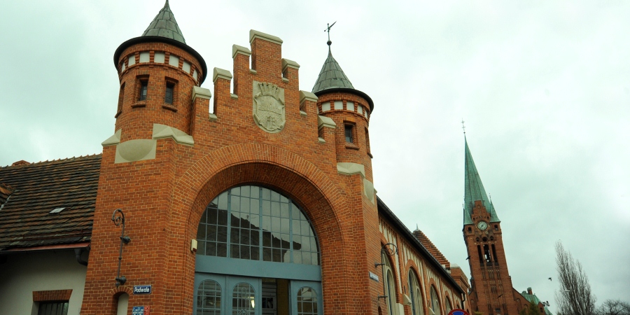 Ulicą Magdzińskiego udajemy się w kierunku zabytkowej hali targowej (24) otwartej w 1906 r. (wg proj. berlińskiej spółki architektów Boswau&Knauer). Nad wejściem do hali znajduje się efektowny herb miasta, natomiast we wnętrzu uwagę zwraca stalowa konstrukcja dachu. Handlowano tutaj mięsem, rybami, rakami i owocami morza. Oś widokową wytyczoną od Starego Rynku przez ul. Magdzińskiego zamyka neogotycki kościół pw. św. Andrzeja Boboli (25) z wysmukłą zegarową wieżą, dominujący nad placem Kościeleckich. Świątynia, zaprojektowana przez berlińskiego architekta Heinricha Seelinga, została wzniesiona w 1903 r. dla bydgoskich ewangelików. Co może zaskakiwać, kościół, którym opiekują się obecnie jezuici, do dziś pozostaje najwyższym budynkiem (75 m) Bydgoszczy.
