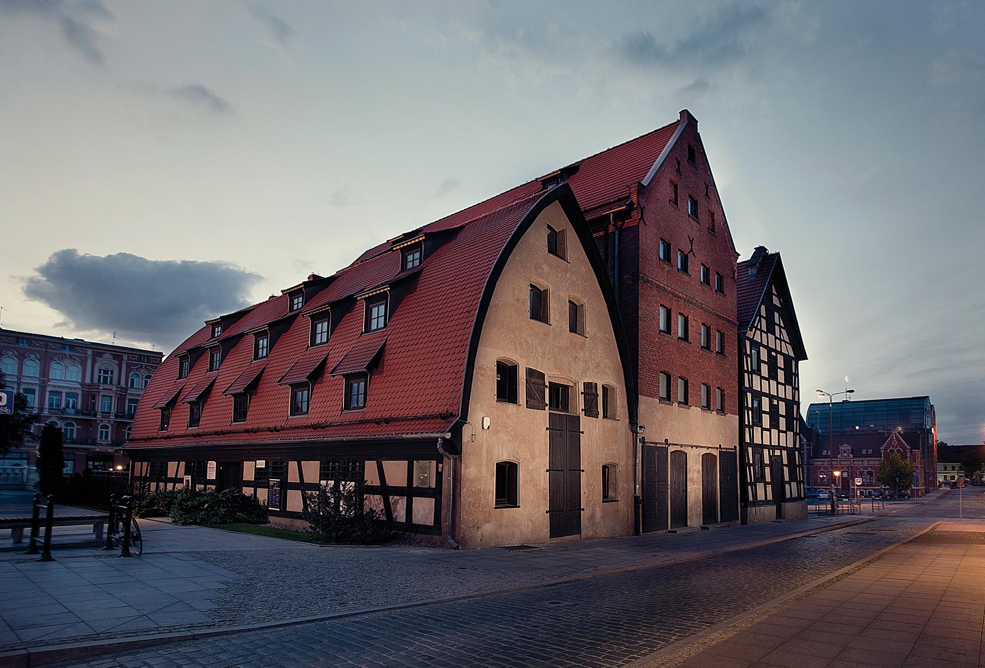 Schodzimy w prawo, w ulicę Mostową. Po kilku chwilach naszym oczom ukazuje się oficjalny symbol miasta, trzy szachulcowe spichlerze (6) z przełomu XVIII i XIX w., malowniczo usytuowane nad Brdą. Dawniej jedne z wielu magazynów zbożowych w mieście, dziś należą do Muzeum Okręgowego im. Leona Wyczółkowskiego. Przed głównym wejściem do budynku znajduje się makieta Bydgoszczy z dawnych wieków. Patrząc na nią możemy dostrzec kilka nieistniejących budynków: ratusz i kościół Jezuitów na Starym Rynku, mały romański kościółek św. Idziego, bramy miejskie oraz zamek bydgoski, który został zniszczony podczas Potopu Szwedzkiego. Udajemy się teraz w kierunku mostu Staromiejskiego im. Jerzego Sulimy-Kamińskiego, na którym zatrzymujemy się na parę chwil, aby spojrzeć na prawo, na chętnie fotografowaną panoramę Bydgoszczy.