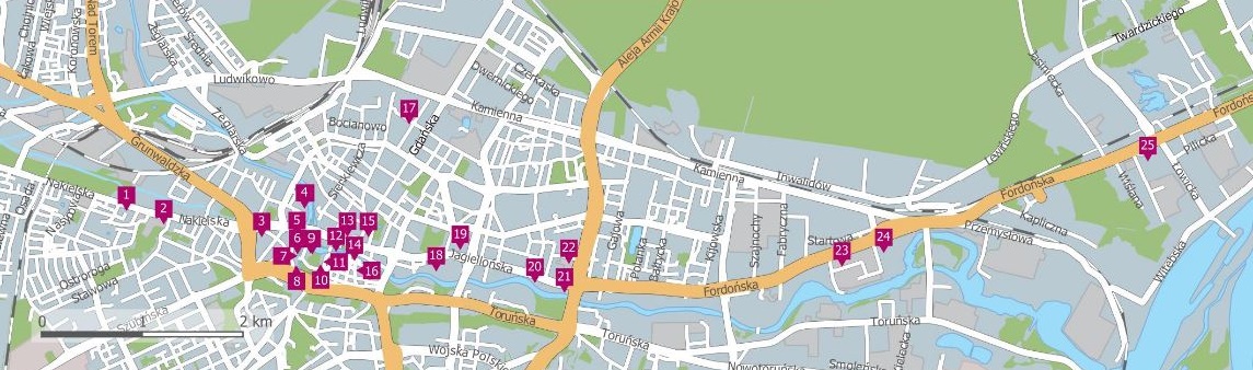 Na mapie industrialnej historii Bydgoszczy warto także zaznaczyć częściowo zachowany kompleks zabudowań gazowni (18), uruchomionej w tym miejscu w 1860 r. – ul. Jagiellońska 42. Nieco dalej, po przeciwnej stronie, przy ul. Jagiellońskiej 43-47, znajdują się budynki frontowe dawnej Rzeźni Miejskiej (19) otwartej w 1890 r. projektu Carla Meyera. W 2006 r. kompleks budynków został włączony w układ centrum handlowego wystawionego w miejscu pozostałych, nieistniejących obecnie zabudowań. Kolejnym obiektem jest hala fabryczna przy ul. Jagiellońskiej 92 (20) niegdysiejszej firmy Brunona Sommerfelda, założonej w 1905 r. Z warsztatu ślusarskiego specjalizującego się w naprawie instrumentów klawiszowych, przekształciła się ona w wytwórnię doskonałej klasy fortepianów, znanych nawet poza granicami Polski. Niestety działała ona tylko do 1945 r. Przy ul. Jagiellońskiej 96 funkcjonował, uruchomiony około 1862 r., młyn parowy, pierwotnie należący do firmy Wolfen & Fließ, a od 1892 r. do Baerwald & Co., który śmiało konkurował z młynami na Wyspie Młyńskiej. Latem 1938 r. nowym właścicielem został Bronisław Kentzer, który uruchomił firmę „Młyny Kentzera” (21). Po dziesięciu latach zostały one upaństwowione. Dziś budynki dawnego młyna oraz magazynu zbożowego z 1916 r. zostały zaadaptowane na Hotel Słoneczny Młyn. Po drugiej stronie ulicy, pod numerem 117, położona jest rozległa nieruchomość, gdzie wśród pięknego starodrzewia wznoszą się funkcjonalistyczne zabudowania fabryki pasmanterii, taśm i pasów „Pasamon” (22), powstałej w 1924 r. i nadal wytwarzającej tkane taśmy i pasmanterię techniczną. Na szczególną uwagę zasługuje willa dyrektora z lat 30. XX w., podobnie jak obiekty fabryczne, zrealizowana wg proj. Jana Kossowskiego. Przedłużeniem ul. Jagiellońskiej jest ul. Fordońska, prowadząca do centrum dawnego miasteczka – Fordonu, dziś będącego dzielnicą Bydgoszczy. Przy tej ulicy przetrwało wiele obiektów przemysłowych. Najbardziej wartościowe, położone po południowej stronie ulicy, to całe zespoły zabudowy fabrycznej. Numer 152 – dawniej Bydgoska Fabryka Kabli – obecnie TELEFONIKA Kable Sp. z o.o. S.K.A. (23). Założona w 1920 r. zyskała kompleks zabudowy złożony z obiektów z lat 1920-1924 i późniejszych. Z najstarszych zachowała się brama wjazdowa i budynek biurowy z halą fabryczną. Z późniejszych wyróżnia się willa dyrektora autorstwa Bronisława Jankowskiego z lat 1930-1931, z ciekawie wykończonym gzymsem. Atutem lokalizacji fabryki był fakt bezpośredniego dostępu do portu rzecznego. Po sąsiedzku, pod numerem 154, od 1914 roku funkcjonują Bydgoskie Zakłady Sklejek (24), również rozlokowane w zabytkowych obiektach, częściowo sięgających czasów powstania przedsiębiorstwa. Dalej w kierunku Fordonu, dojedziemy do wieżowca znajdującego się przy ul. Fordońskiej 246, w którym kiedyś mieściły się biura słynnych zakładów rowerowych Romet (25) budynki w których odbywała się produkcja zostały rozebrane.